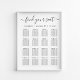 Stilvoll herunterladbare Hochzeitssitzplakatposter für bis zu 16 Tische mit "Finden Sie Ihren Platz" in einem schicken Skript mit Swashes und Ihre Namen und Hochzeitsdatum verbunden durch ein Herz in einfacher moderner Typografie. Mit der Option zum digitalen Download können Sie Änderungen in letzter Minute bearbeiten und lokal drucken.