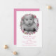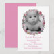 Hübsche Ankündigung eines Mädchens in knuspriger Weiß mit Vintagen Kunstwerken eines rosa Rosenkranzes, mit Ausschnitt für das Foto eines Babys. Personalisieren Sie den rosa Text mit den Geburtsinformationen Ihres Babys. Eine wunderschöne Art, das Neugeborene mit Freunden und der Familie zu zeigen.