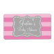 Personalisierte DIY Wasserflaschenaufkleber mit gestreiftem Hintergrund und Klappform. Stilvolle Skripttypografie für den Namen und das Geburtsdatum von Jungen oder Mädchen. Verwenden Sie als klassische Tischdekoration oder danken Sie für die Gäste des Party. Neutrales Design mit anpassbarer Hintergrundfarbe.