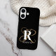 Dieses moderne, personalisierte Monogramm-Handy verfügt über ein elegantes, goldenes Skript, das zunächst mit einem fett weißen Initial und Namen überlagert wurde, auf schwarzem Hintergrund.