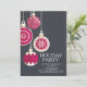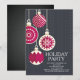 Zeitgenössische Weihnachtsbällchen-Party Einladung mit lustigen Retro-Weihnachtsbällen Set auf schwarzem Streifen-Hintergrund.