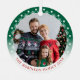 Stilvoll, bunt, zweiseitig, zwei Foto, runde Ornamente. An der Vorderseite zeigt dieses individuelle Ornament-Design Ihr persönliches Foto, das in einem einzigartigen, weißen und grünen Gradientenrahmen mit zarten Schneeflocken hervorgehoben ist. Die Designs der modernen Typografie zeigen Ihren Familiennamen und das Jahr oder können bearbeitet werden, um alles zu lesen, was Sie wollen. Der Text ist in einer warmen Urlaubfarbe rot, die auch leicht in beliebiger Farbe Ihrer Wahl bearbeitet werden kann. Auf der Rückseite des Ornaments wird Ihr zweites Foto vollständig angezeigt. Das perfekte Geschenk für den Sake und das Baum-Dekor für den Urlaub & Weihnachten.