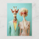 Ein surreales Pop-Kunstbild mit einer Giraffe und einer glamourösen Frau in eleganten, Vintag inspirierten Outfits. Beide tragen eine überdimensionale rote Sonnenbrille, die vor einem türkisfarbenen pastellfarbenen Hintergrund einen modischen Charme ausstrahlt.