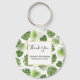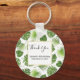 Eine Schlüsselkette für das Gastgeschenk mit einem hübschen Muster aus grünen tropischen Blätter. Exotisches Design. Ein weißes Quadrat mit einem goldenen Imitat-Folienabrand, der oben mit dem Text im Inneren platziert ist.