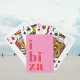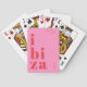 Spielen Sie stilvolle Karten während Ihres Ibiza-Aufenthalts mit diesen kühnen und modernen Spielkarten mit dem Thema Ibiza. Das Wort "Ibiza" mit seinem auffälligen typografischen Design ist kreativ in drei Zeilen in schlanker, kleingeschriebener Schrift unterteilt. Dieses dezent und dennoch minimalistisch gestaltete, in leuchtend rosa Farbe bedruckte Design verleiht Ihren Spielabenden oder Reisezielen einen lebendigen Pop. Ideal für Strandausflüge, Party oder als einzigartiges Souvenir, bringen diese Karten eine Touch modernen Flairs zu jeder Hand, die Sie tun.