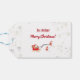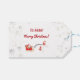 Niedliche, mädchenhafte, aber auch elegante personalisierte Weihnachtsgeschenktafeln mit einer Illustration eines magischen, glamourösen Einhornpferdes mit einem roten und goldenen Mane und Schwanz, der den Schlitten des Weihnachtsmannes zieht (voller Geschenke), den Gruß "Frohe Weihnachten!" in kursiver Schrift / Kalligrafie und einem individuelle Name. Das Design umfasst silberne und cremefarbene Schneeflocken und Sterne für eine festliche Urlaubsstimmung.