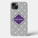 Fügen Sie Ihren Namen Vorlage marokkanischen Tile Muster iPhone 13 Fall - elegantes hellgraues und weißes marokkanisches Gittermuster mit einem stilvollen lila Fliesenschild. Ein schicker, trendiger, mädchenhafter Fliesendesign, der Mädchen ein cooles, individuelles Geburtstagsgeschenk machen würde.