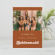 Eine einfache und elegante Fotokarte, um Ihrer Brautjungfrau zu danken. Ein Retro-Chic-Thema: adoptier dieses Vintage und stilvolle typografische Design für deine Hochzeitsarbeit mit einem verbrannten orangefarbenen Thema. Leicht zu mischen und mit unserer ähnlichen Schreibwaren erhältlich in pfirsichrosa, terracotta & braun Zucker. Vollständig anpassbare Textfarben und Hintergründe.