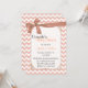Stilvolle Babydusche in einem leicht pfirsichfarbenen und weißen Zickzack Zickzackmuster. Die Grafik eines hellbraunen, hellpfirsichfarbenen, weißen Textbereichs in der Mitte, hat ein hübsches dunkelpfirsichfarbenes Satin, das Bänder und Bogen aussieht, oben. Die Rückseite ist im gleichen Zickzack Muster, mit einem anderen Textbereich am unteren Rand. Personalisieren Sie den gesamten Text, vor und zurück zu Ihrem Anzug.