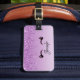 Personalisierter Gepäckanhänger in trendigem Design. Der Hintergrund ist eine lila Farbskala mit einem Fake, das von oben nach unten glänzt. Ein Paar von gürtelig niedlichen Wimpern unter dem Glitzer-Bild.