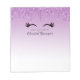 Ein Notizblock in trendigem Design. Der Hintergrund ist eine lila Farbskala mit einem Fake, das von oben nach unten glänzt. Ein Paar von gürtelig niedlichen Wimpern unter dem Glitzer-Bild.