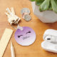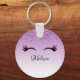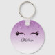 Personalisierter Schlüsselanhänger mit trendigem Design. Der Hintergrund ist eine lila Farbskala mit einem Fake, das von oben nach unten glänzt. Ein Paar von gürtelig niedlichen Wimpern unter dem Glitzer-Bild.