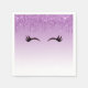 Papierservietten in trendigem Design. Der Hintergrund ist eine lila Farbskala mit einem Imitat, das Glitzer von oben nach unten funkelt. Ein Paar von gürtelig niedlichen Wimpern unter dem Glitzer-Bild.