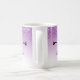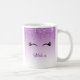 Personalisierte Kaffee-Tasse mit trendigem Design. Der Hintergrund ist eine lila Farbskala mit einem Fake, das von oben nach unten glänzt. Ein Paar von gürtelig niedlichen Wimpern unter dem Glitzer-Bild.