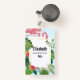 Personalisiertes Abzeichen mit einem niedlichen und skurrilen rosa Flamingo. Umgeben von grünen tropischen Blätter und Blume aus rotem und gelbem Hibiskus. Ein rechteckiger, goldener Rahmen in der Mitte.