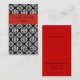 Elegante Damen-Visitenkarte, getan in einem Schwarzweiss-Damastmuster. Ein roter mutiger Streifen, über der Spitze und die feste Rotrückseite hat den schwarzen Text, der bereit ist, mit Ihren Informationen zu personifizieren. Ein reizendes stehen heraus die Karte, die für irgendeine Art Beruf oder Geschäft groß ist.