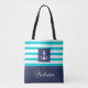 SeeTaschentasche mit gestreiftem Muster des Türkis- u. Marineblaus und kundengerechtem Text.