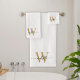 Stilvolle Girly Feminine Moderne White and Gold Monogram Initial Name Signature Script Custom Personalisiert Bath Handtuch Set. Mit einem Vornamen (oder Familiennamen) in einem hübschen handgeschriebenen Stil Swash Schwanz Typografie (oder Kalligrafie) mit Monogramm Initial in Gold und Schwarz auf weißem Hintergrund. Große stilvolle feminine Hauswärmeschenke, auch für Geburtstag, Hochzeit, Brautparty, Junggeselinnen-Abschied, Muttertag, süße 16 Geburtstagsparty, Jubiläumsgeschenk und für Graduiertenfeier. Es ist für das Mädchen, das stilvolle Eleganz liebt.