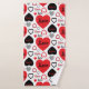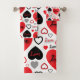 Stilvolles Badetuch-Set mit roten, schwarzen und grauen Herzen und LIEBE auf weißem Hintergrund.