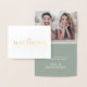 Eine stilvolle, moderne Goldfolienkarte aus dem Foto mit Ihrem Nachnamen in klassischer Typografie, gepaart mit einem handgeschriebenen Schriftart in Weiß auf einem goldenen Hintergrund. Ihr besonderes Foto wird in diesem einzigartigen, modernen und minimalen Design wunderschön aussehen. Das Design zeichnet sich durch ein wunderschönes Salbei-Grün im Inneren aus. Ein lustiges, minimales Design, um sich von der Menge in dieser Weihnachtszeit abzuheben! Das abgebildete Bild dient nur zur Veranschaulichung, um durch Ihr eigenes Foto ersetzt zu werden. Das Bild der Platzhalter ist ein wunderschönes, glückliches junges Paar, das auf ihren Ellenbogen auf dem Boden ihrer modernen neutralen Zuhause sitzt.
