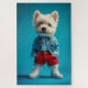 Dieses charmante Bild besticht durch einen West Highland White Terrier, der in einer hellblauen Denim-Jacke, einem weißen T - Shirt, lebendigen, roten Shorts und weißen Sneakers verkleidet ist. Set vor einem sauberen, blauen Hintergrund, dieser stilvolle junge Mann strahlt Persönlichkeit und Charme aus und macht es zu einem reizvollen und herzlichen Anblick für Mode- und Hundefreunde gleichermaßen.