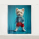 Dieses charmante Bild besticht durch einen West Highland White Terrier, der in einer hellblauen Denim-Jacke, einem weißen T - Shirt, lebendigen, roten Shorts und weißen Sneakers verkleidet ist. Set vor einem sauberen, blauen Hintergrund, dieser stilvolle junge Mann strahlt Persönlichkeit und Charme aus und macht es zu einem reizvollen und herzlichen Anblick für Mode- und Hundefreunde gleichermaßen.