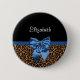 Bleibe Sie auf Mode mit diesem stilvollen braunen Pelzleopard-Druckknopf mit einem eleganten blauen Band, das in einen Chicbogen gebunden wird. Personifizieren Sie diesen modernen und noblen Tierdruckentwurf, indem Sie Ihren Namen addieren. Ebenedruckbild, nicht tatsächlicher Pelz oder Band.