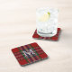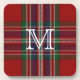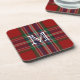 Stilvoller roter kundenspezifischer Monogramm-Untersetzer mit dem karierten Muster traditionellen Clan MacFarlane Tartan. Ein großes Buchstabemonogramm des Weiß eins verziert die Mitte, und ist zu jedem möglichem Buchstaben kundengerecht, den Sie wollen.
