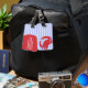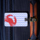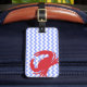 Stilvoller Sommerspaß-Gepäckumbau getan in einem blauen und weißen trendy Zickzack Muster. Die Front des Umbaus hat eine gedämpftes Rot farbige Silhouette einer Krabbe, und die Rückseite hat einen kreisförmigen roten Textbereich, auf dem links. Weißer Text ist bereit zu personifizieren. Groß für Gepäck und mehr.