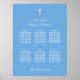 Stilvolles Blue 6 Table Baptim Seating Chart Poster, personalisieren Sie bitte den Namen der Person, die getauft wird, und die Namen der Gäste zusammen mit einem anderen Text, den Sie vielleicht personalisieren möchten. Ein stilvolles Plakat mit elegantem weißem Text auf einem zartem, sanften blauen Hintergrund.