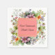 Hübsche Papierservietten aus Brautparty in Weiß, mit farbenfrohen Wildblumen. Ein Textbereich aus Korallen und Gold, in der Mitte, der Serviette, hat einen schwarzen Text. Personalisieren Sie den Text so, dass er Ihren Anforderungen entspricht.