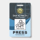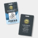 Die farbenfrohen, blauen Schattenwellen werden durch einen globalen Aufdruck an der oberen Ebene des Abzeichens verstärkt. Hier ist ein optionales Imitat Gold Global City Silhouette Logo können Sie verwenden. Danach folgen Ihr Prestigename, Ihr Jobtitel und eine Fotovorlage zum Hochladen von Fotos bis zu einer Größe von 1.000 x 1.000 Pix. In der Nähe der Basis des Abzeichens ist ein Kommentar-Titel "PRESS". Sie können die Beschriftung an Ihren Anzug ändern. Unten liegt der Name der Organisation.