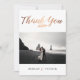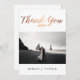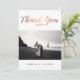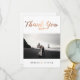 Stilvolle Hochzeit danke Ihnen postcard Vorlage mit einem Foto auf der Vorderseite mit dem Text "Danke" in einem modernen Drehbuch-Schriftart in Imitaten glänzend Gold. Es gibt auch eine kleine Foliage Abbildung unter dem Text in Imitat Gold. Benutzerdefiniert Dankeschön Nachricht auf der Rückseite der Karte. Elegantes und modernes Design.