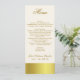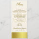 Elegantes dünnes Hochzeits-Empfangs-Tabellenmenü, erfolgt im Elfenbein, mit Grafiken des goldtone Bandes entlang der Unterseite und Bedeckung die Rückseite. Der kundenspezifische Text, der in einem goldenen Braun erfolgt ist, ist bereit, für Ihren Hochzeits-Empfang zu personifizieren. Reizender Zusatz zu unserem stilvollen Goldtone Hochzeits-Set.