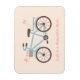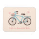 Ein Zitat, das auf Leben und Fahrräder anwendbar ist. Es heißt "Das Leben ist eine schöne Fahrt" illustriert mit einem blauen Fahrrad und Schmetterlingen, die von den Blume angezogen werden. Farbpalette aus Rosa, Pastellblau, Braun und Grau.