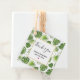 Bevorzugen Sie Tags mit einem hübschen Muster aus grünen tropischen Blätter. Exotisches Design. Ein weißes Quadrat mit einem goldenen Imitat-Folienabrand, der oben mit dem Text im Inneren platziert ist.