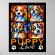 Dieses niedliche Poster ist perfekt für einen Hundefreund, der 4 bezaubernde, stylisierte Welpen in lebhaften Farben und die Worte "Welpe Liebe" mit Hundepfeffern vorfindet.