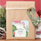 Küchenaufkleber mit einem niedlichen und skurrilen rosa Flamingo. Umgeben von grünen tropischen Blätter und Blume aus rotem und gelbem Hibiskus. Ein quadratischer goldener Rahmen in der Mitte.