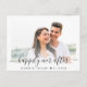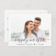 Moderne und schicke Ankündigung Datum freihalten Postkarte mit Ihrem Foto überlagert mit "fröhlich immer danach" in einem stilvollen Drehbuch mit Swashes und Ihren Namen und Hochzeitstag verbunden mit einem Herz. Auf der Rückseite passen Sie Ihre Save the Date Nachricht in eleganter Typografie an und fügen Sie Ihre Namen in ein signaturähnliches Skript ein.