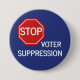 Taste mit Stoppschild und Text "Stopp Voter Suppression" auf dunkelblauem Hintergrund.
