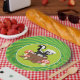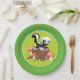 Diese Geburtstags-Partyplatte kennzeichnet ein niedliches clipart Schwarzweiss-Stinktier, das auf einem Baumstumpf sitzt, der durch drei rot und weiße Pilze umgeben wird. Der Hintergrund der Platte ist in der Mitte mit koordinierenc$zweiton grünen Streifen auf der Kante der Partyplatte grün.