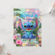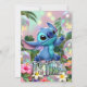 The image is an invitation card with a tropical, whimsical, and colorful theme, centered around the Disney character Stitch (from Lilo & Stitch).