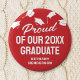 Roter Abschluss Button mit fallenden Mörtel-Kappen, dem Text "Stolz auf unseren 2025-Absolvent" und dem Notennamen.