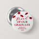 Roter Abschluss Button mit fallenden Mörtel-Kappen, dem Text "stolz auf unseren Absolvent", dem Notennamen und dem Klassenjahr.