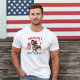 Eine spielerische und detaillierte Abbildung einer Dackel mit sternförmige Sonnenbrille, einer patriotischen Kappe mit der Bezeichnung "Amerika" und einer rot-weiß-blauen Bandana. Der Hund hält eine kleine amerikanische Fahne im Mund, stehend stolz unter fett gedrucktem Text, der lautet: "Proudly Pawtriotic". Feuerwerke und Sternakzente in Rot und Blau ergänzen das festliche und patriotische Thema. Der Stil ist kartoonisch mit glatter Schattierung und lebhaften Farben.