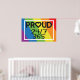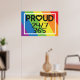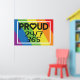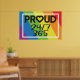 Stolzes Poster mit der Beschriftung "Proud 24/7 365" in schwarzen Schriftart auf einem regenbogengestreiften Hintergrund