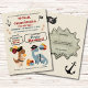 Dinosaurier in Piratenkleidung laden zu einer lustigen, schwindelerregenden Piraten-Dinosaurier Geburtstagsparty für Zwillingsjungen ein! Die bezaubernden T-Rex- und Brontosaurus-Dinosaurier sind als Piraten gekleidet und haben farbenfrohe Ballons und Geschenke. Passen Sie die Namen, das Alter, Ihre Veranstaltungsdetails und die Anweisungen oder andere Anweisungen auf der Rückseite an. Dieser Artikel ist Teil der Dinosaurier Pirates Twin Boys Birthday Party Collection.
