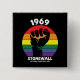 Gay Pride-Button-Design zeigt eine trotzige Faust auf Regenbogen-Hintergrund mit 1969 - NYCs Stonewall-Aufruhr Gedenktext.