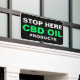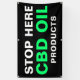 Steigern Sie Ihr Geschäft mit diesem Stopp Here For CBD Oil Bold Green Black Business Banner. Es ist ein moderner, großer Schriftart-Stil, mit schwarzem Hintergrund und großen weißen und leuchtend neongrünen Buchstaben. Der Text lautet "Stopp here" und CBD Ölprodukte." Outdoor-Banner im Foto. Auch für Innenräume und in verschiedenen Größen erhältlich.