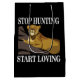 Stopp Hunting Loving Lioness Medium Gift Bag Original Digital Illustration von Nisha Prabhu. Mit Lioness sitzen auf einem Berg mit Typografie ''Stopp Jagd. Beginnen Sie zu lieben.'''''' macht eine kühne Aussage beim Geschenken mit unserer Stopp Hunting Start Loving Lioness Medium Gift Bag! Zeigen Sie Ihre Unterstützung für den Naturschutz mit diesem auffälligen Design, das sich für den Schutz dieser großartigen Tiere einsetzt. Diese Geschenktasche ist perfekt für Tierliebhaber und Fürsprecher von Mitgefühl. Sie verleiht jedem Geschenk eine Touch von Sinn und Stil. Machen Sie Ihr Geschenkerlebnis unvergesslich und sinnvoll mit einer Tasche, die Bände über Liebe und Koexistenz spricht.